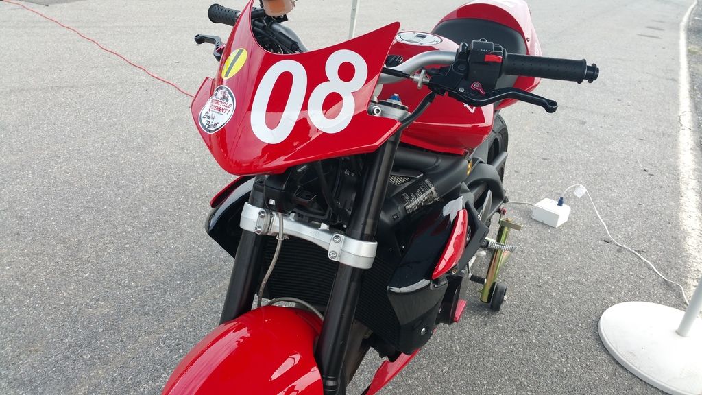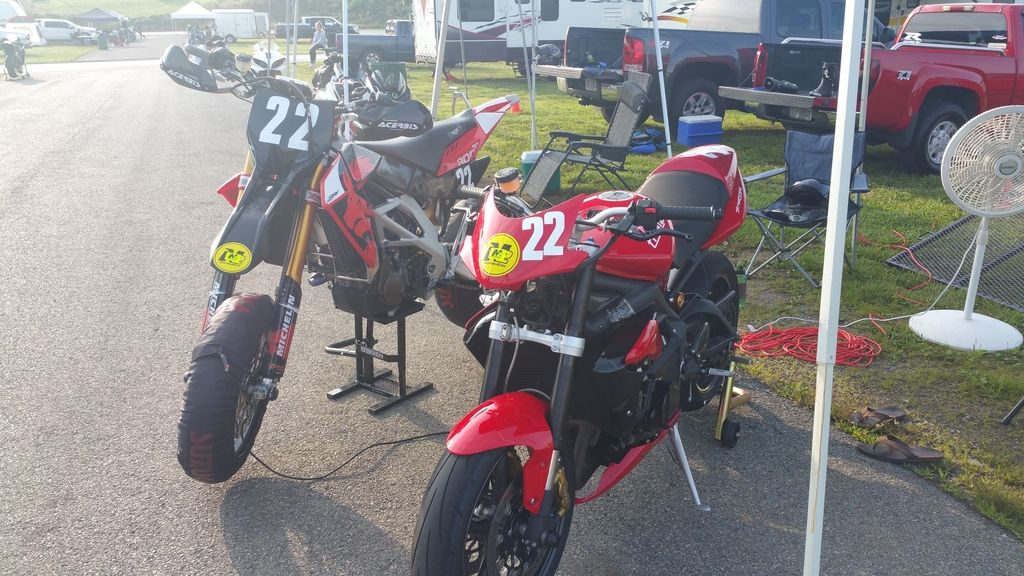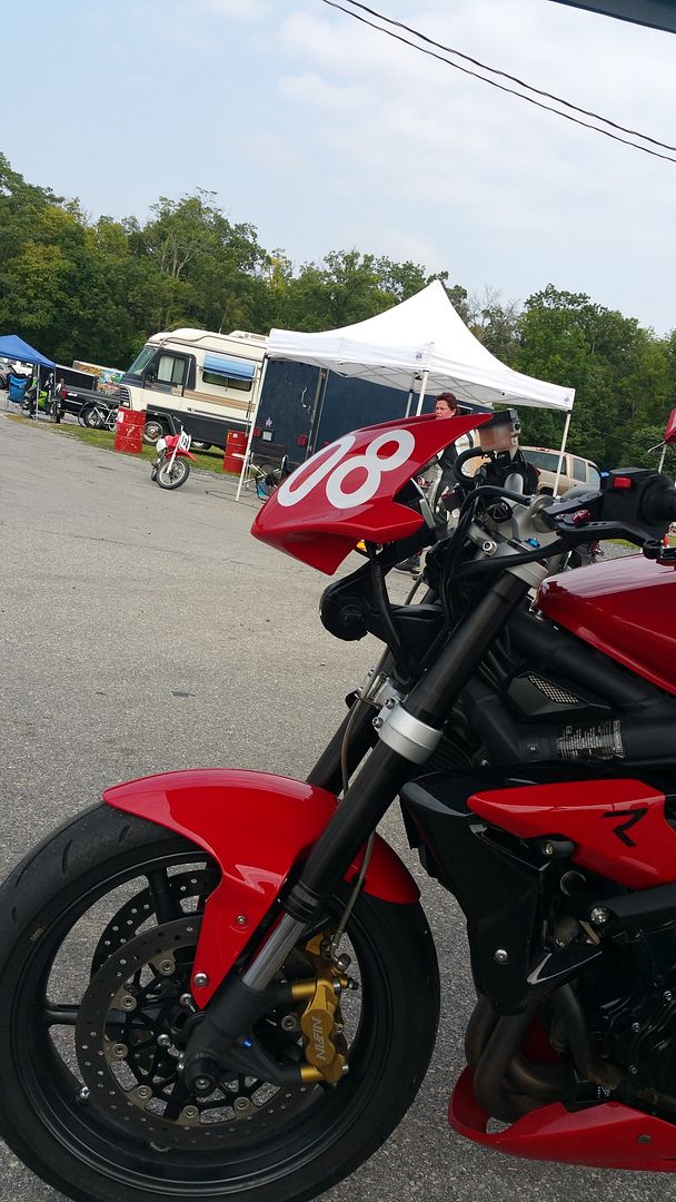 I taped up the headlights on my Striple and set out. I had gone through a ton of effort to install full Ohlins forks and an Ohlins rear shock, Brembo brakes, the whole deal. I wanted to see just what my street bike could do on the track. I had a blast, despite being reserved because I really REALLY didn't want to crash my baby. I even had a "moment" when my front tucked but I saved it, stood the bike up, and coasted into the grass.